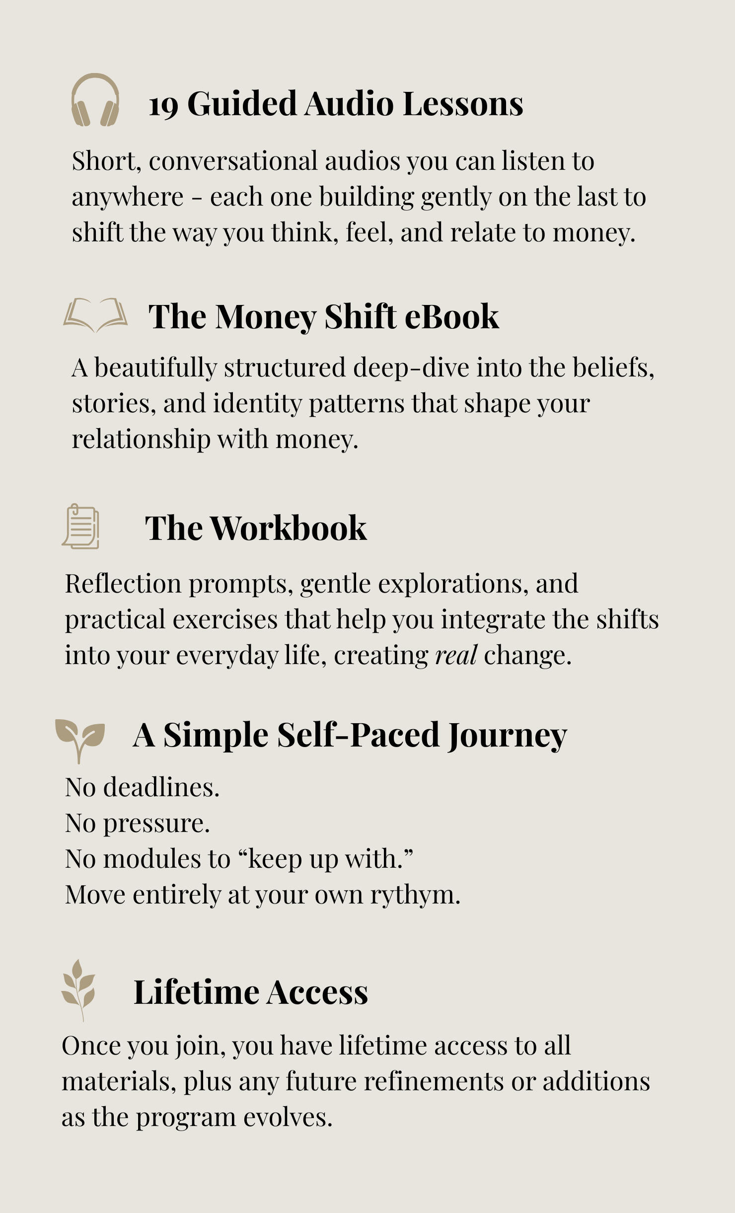 Most people have no idea they've been conditioned to respond to money the way they do. Every. Single. Day.This isn't taught in schools. It’s rarely talked about at home. You won’t find it in the workplace, or even over coffee with friends.But it is talked about inside The Money Shift. Where you’ll discover how to stop unconsciously blocking money, and finally let it in.This is an invitation into a conversation most people will go their whole lives never having. A conversation about MONEY. And one that has the potential to shift everything. Not just for you, but for your children.And theirs.The Money Shift is a self-paced program designed to help you rewire your thoughts, beliefs, and energy around money, from the inside out.Finally you’ll uncover what’s really blocking your flow...and create space for wealth, safety, and ease.