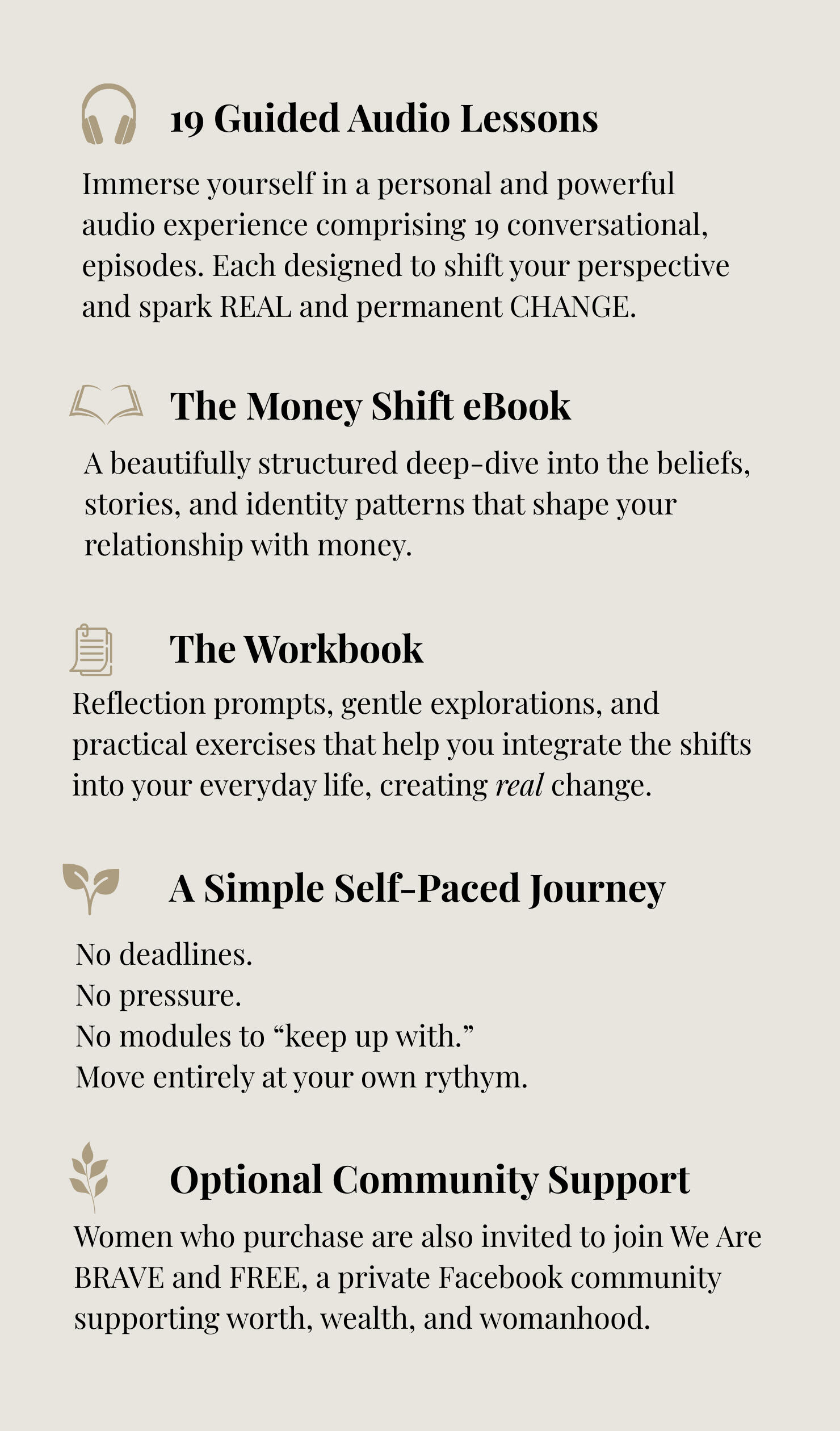 The Money Shift is open to everyone.The optional We Are BRAVE and FREE Facebook community is a women-only space, created to honour the emotional safety, intimacy, and depth of the conversations shared there.If you’re a man joining The Money Shift, you are warmly welcome to connect with me on my personal Facebook page for reflections, questions, and support as you move through the program.